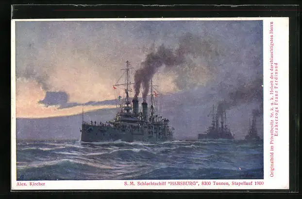 Künstler-AK Alexander Kircher: Österr. Schlachtschiff SM Habsburg gibt Volldampf