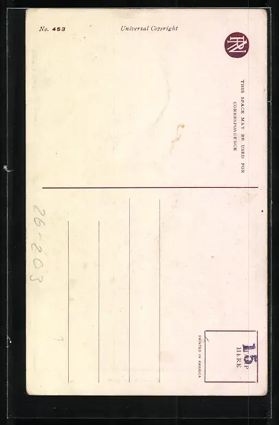 Personenbezogene Daten auf der Rückseite der Karte wurden durch blauen Textmarker unkenntlich gemacht. Die blauen Stellen sind auf die Vorderseite durchgeweicht und wirken sich negativ auf das Postkartenfoto aus
