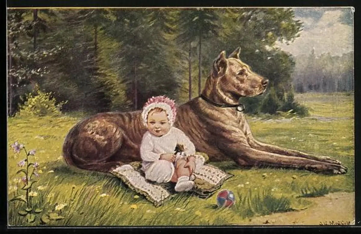 Künstler-AK Alfred Mailick: Baby mit Dogge auf einer Wiese sitzend