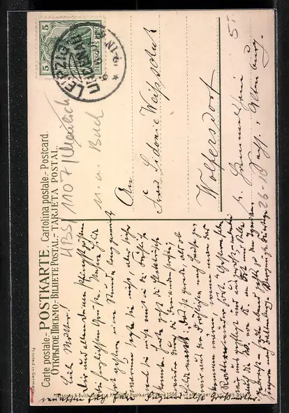Personenbezogene Daten auf der Rückseite der Karte wurden durch blauen Textmarker unkenntlich gemacht. Die blauen Stellen sind auf die Vorderseite durchgeweicht und wirken sich negativ auf das Postkartenfoto aus