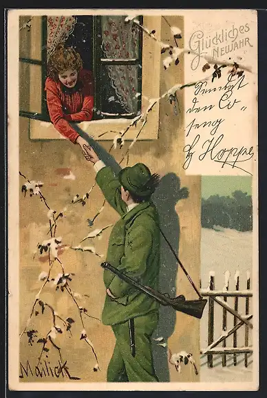 Künstler-AK Alfred Mailick: Jäger reicht an einem Fenster einer Dame die Hand, Glückliches Neujahr