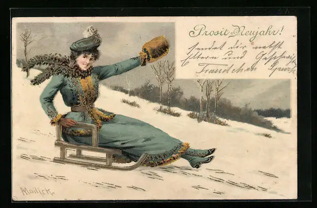 Künstler-AK Alfred Mailick: Junge Frau fährt Schlitten, Neujahrsgruss