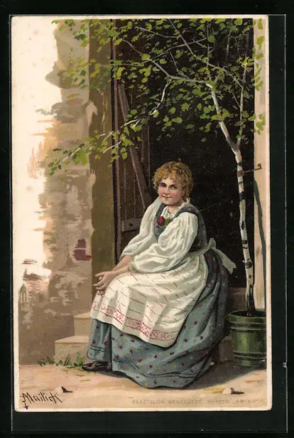 Künstler-AK Alfred Mailick: Junge Frau im Dirndl auf einer Eingangstreppe
