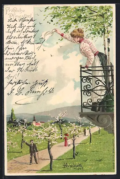 Künstler-AK Alfred Mailick: Junge Frau winkt einem Herrn vom Balkon