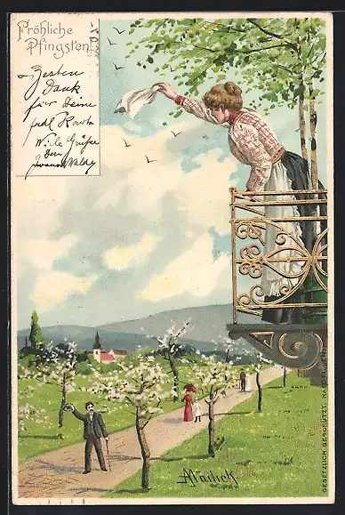 Künstler-AK Alfred Mailick: Junge Frau winkt einem Herrn vom Balkon