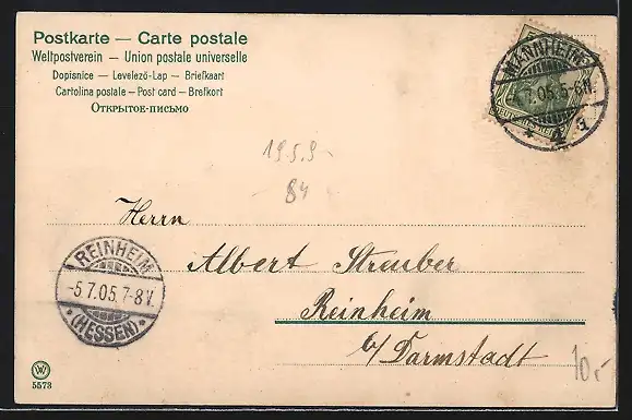 alte Ansichtskarte, gelaufen 1905, vorderseitig Klebe- und Papierreste, Albumspuren, guter Zustand