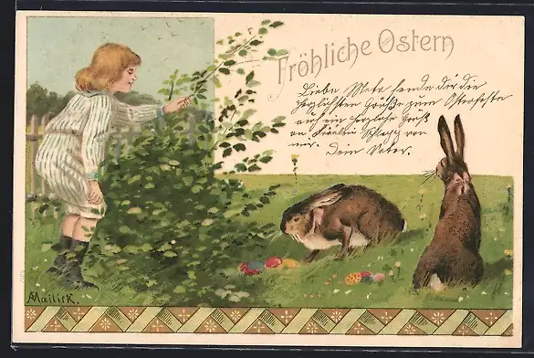 Künstler-AK Alfred Mailick: Kind beobachtet zwei Osterhasen
