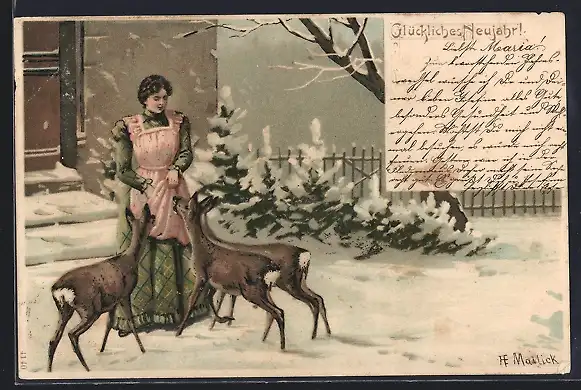 Künstler-AK Alfred Mailick: Neujahr! Frau füttert Rehe
