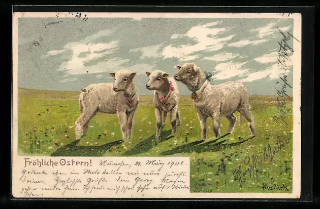 Künstler-AK Alfred Mailick: Ostergruss mit drei Lämmchen