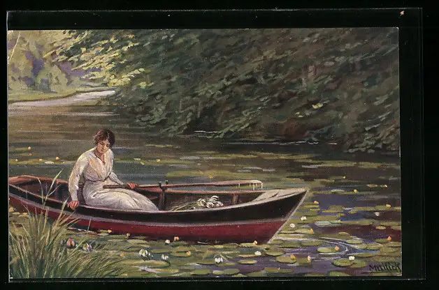 Künstler-AK Alfred Mailick: Schöne Frau in einem Ruderboot sammelt Wasserrosen