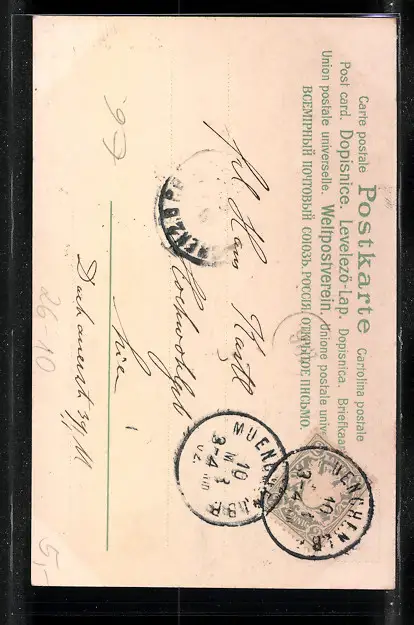 Personenbezogene Daten auf der Rückseite der Karte wurden durch blauen Textmarker unkenntlich gemacht. Die blauen Stellen sind auf die Vorderseite durchgeweicht und wirken sich negativ auf das Postkartenfoto aus