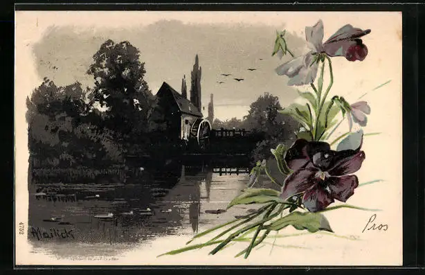 Künstler-AK Alfred Mailick: Wassermühle mit Blumendekor