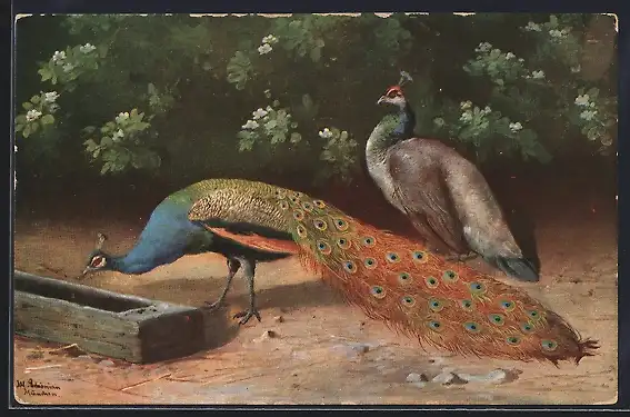 Künstler-AK Alfred Schönian: Ein Pfauenpaar, er trinkend
