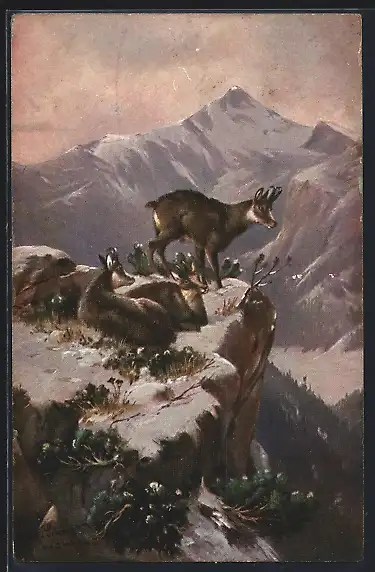 Künstler-AK Alfred Schönian: Gemsen-Rudel auf einem Felsvorsprung