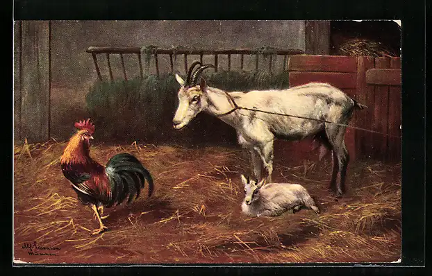 Künstler-AK Alfred Schönian: Hahn, Ziege und Zicklein im Stall