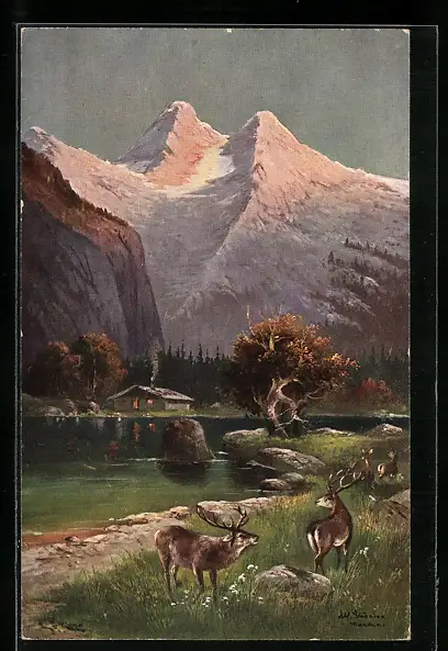 Künstler-AK Alfred Schönian: Hirsche an einem Ufer
