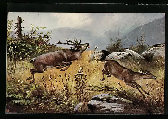 Künstler-AK Alfred Schönian: Hirsche springen über eine Wiese