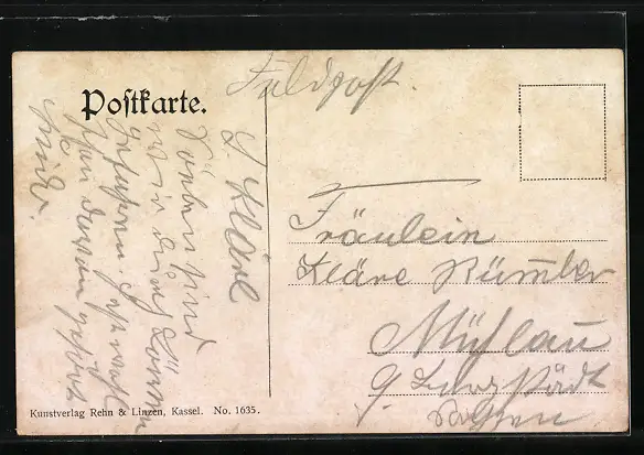 Personenbezogene Daten auf der Rückseite der Karte wurden durch blauen Textmarker unkenntlich gemacht. Die blauen Stellen sind auf die Vorderseite durchgeweicht und wirken sich negativ auf das Postkartenfoto aus