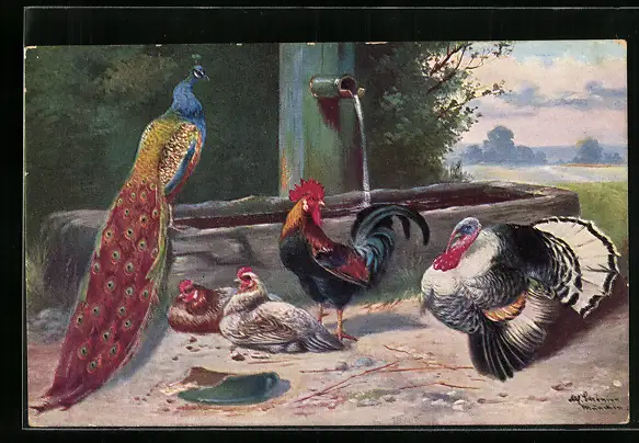 Künstler-AK Alfred Schönian: Pfau, Truthahn und Hühner am Trog