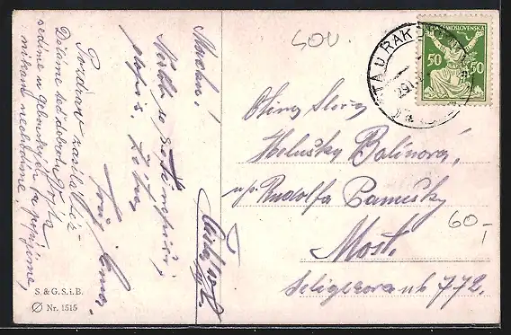 Personenbezogene Daten auf der Rückseite der Karte wurden durch blauen Textmarker unkenntlich gemacht. Die blauen Stellen sind auf die Vorderseite durchgeweicht und wirken sich negativ auf das Postkartenfoto aus