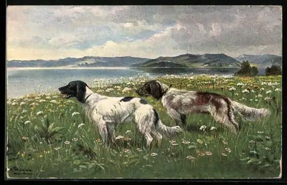 Künstler-AK Alfred Schönian: Zwei Jagdhunde auf einer Blumenwiese