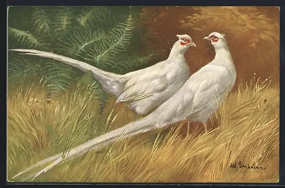 Künstler-AK Alfred Schönian: weisse Fasane im Gras