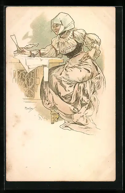 Künstler-AK Alphonse Mucha: Junge Frau mit Haube schreibt einen Brief