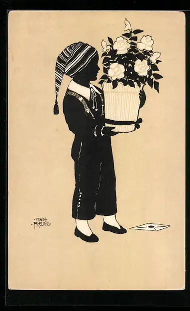 Künstler-AK Alwin Freund: Kleines Kind mit Zipfelmütze und Blumentopf