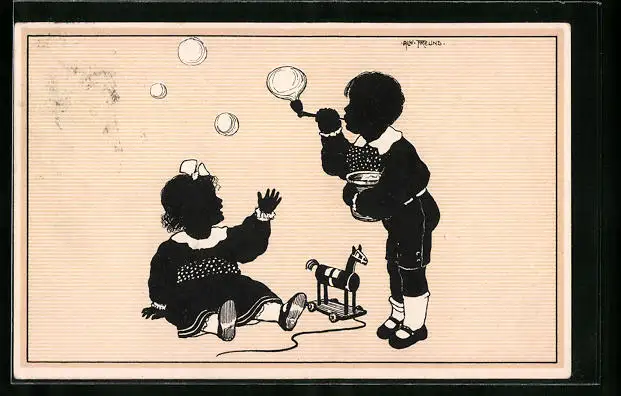 Künstler-AK Alwin Freund: Zwei Kinder machen Seifenblasen, kleines Holzpferd
