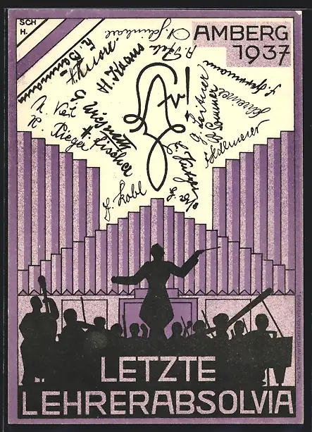 Künstler-AK Amberg, Letzte Lehrerabsolvia 1937, Orchester und Dirigent