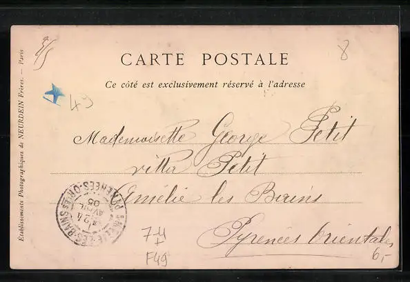 Personenbezogene Daten auf der Rückseite der Karte wurden durch blauen Textmarker unkenntlich gemacht. Die blauen Stellen sind auf die Vorderseite durchgeweicht und wirken sich negativ auf das Postkartenfoto aus