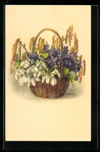 Künstler-AK Anna Haller: Korb mit Veilchen, Schneeglöckchen und Haselnusszweigen