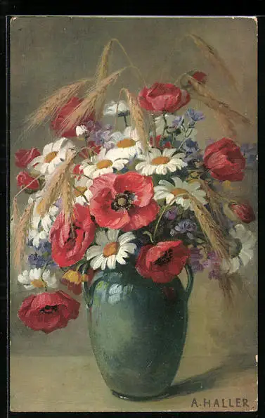 Künstler-AK Anna Haller: Mohnblumen und Margeriten in einer Vase