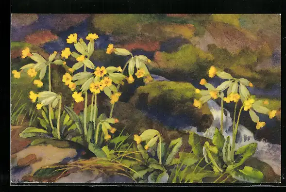 Künstler-AK Anna Haller: Primeln zwischen Steinen