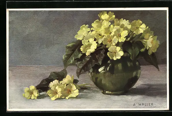 Künstler-AK Anna Haller: Vase mit gelben Primeln