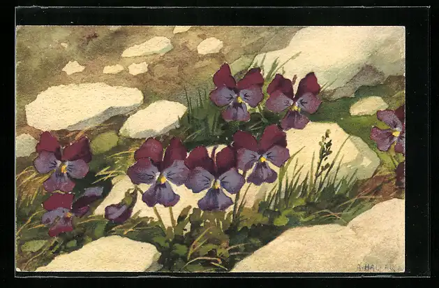 Künstler-AK Anna Haller: blaue Stiefmütterchen