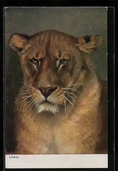Künstler-AK Ansicht Löwin mit grimmigem Ausdruck