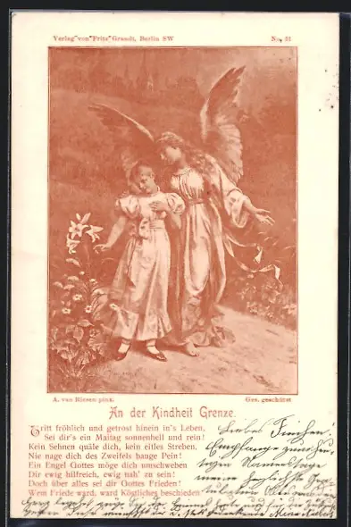 Künstler-AK Arno von Riesen: Engel beschützt ein Mädchen