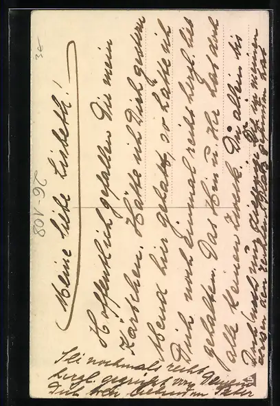 Personenbezogene Daten auf der Rückseite der Karte wurden durch blauen Textmarker unkenntlich gemacht. Die blauen Stellen sind auf die Vorderseite durchgeweicht und wirken sich negativ auf das Postkartenfoto aus
