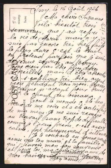 Personenbezogene Daten auf der Rückseite der Karte wurden durch blauen Textmarker unkenntlich gemacht. Die blauen Stellen sind auf die Vorderseite durchgeweicht und wirken sich negativ auf das Postkartenfoto aus