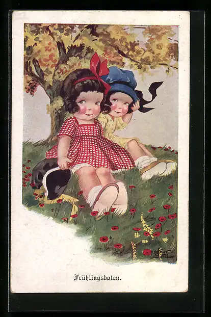 Künstler-AK Arthur Butcher: Frühlingsboten, Zwei Mädchen auf einer Blumenwiese