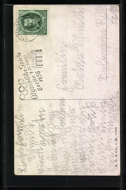 Personenbezogene Daten auf der Rückseite der Karte wurden durch blauen Textmarker unkenntlich gemacht. Die blauen Stellen sind auf die Vorderseite durchgeweicht und wirken sich negativ auf das Postkartenfoto aus