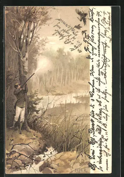Künstler-AK Arthur Heyer: Jäger schiesst auf einen Wildvogel