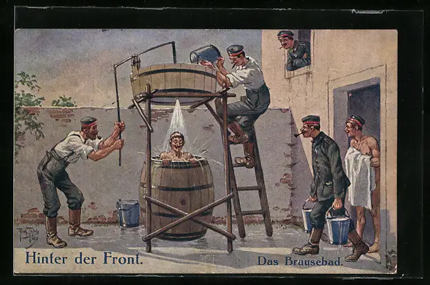 Künstler-AK Arthur Thiele: Hinter der Front, Soldaten beim Brausebad