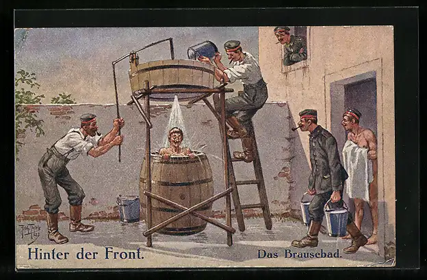 Künstler-AK Arthur Thiele: Soldaten hinter der Front beim Brausebad