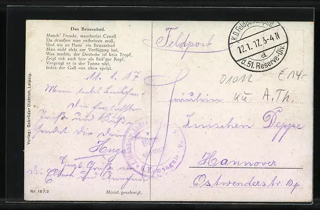 alte Ansichtskarte, gelaufen 1917, Eckknicke li., guter Zustand