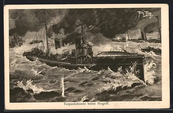 Künstler-AK Arthur Thiele: Torpedoboote beim Angriff