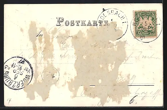 alte Ansichtskarte, gelaufen 1897, rückseitig Klebe- und Papierreste, Stempelspur, guter Zustand
