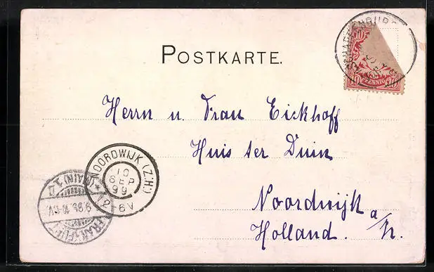 alte Ansichtskarte, gelaufen 1899, Briefmarke tw. entfernt, Eckknicke li. oben, guter Zustand