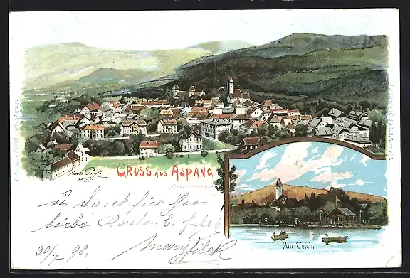 Künstler-AK Aspang, Ruderboote auf dem Teich, Ortsansicht